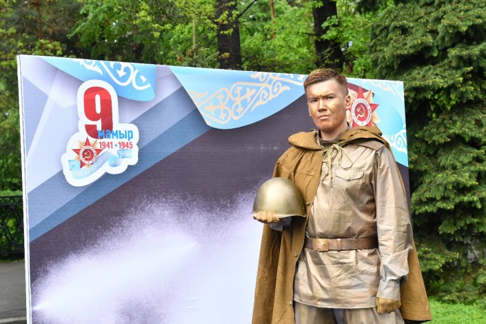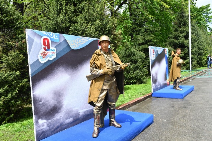 В парке имени 28 гвардейцев-панфиловцев актеры Театра юного зрителя имени Г.Мусрепова воссоздали живые статуи Бауыржана Момышулы, Алии Молдагуловой, Маншук Маметовой, Ивана Панфилова, Талгата Бигельдинова, Рахымжана Кошкарбаева, Малика Габдуллина, Сергея Луганского, проходит выставка боевой техники. На площади перед Мемориалом славы расположена стена благодарности и фотозоны "Біз - батырлардың ұрпағы", объемные хэштеги "#Біз – батырлар_ ұрпағымыз!", "#Мы_дети - победителей!" и другое.