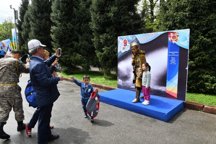 Статуи Алии Молдагуловой, Бауыржана Момышулы и Маншук Маметовой "ожили" в Алматы Фото пресс-службы акима Алматы.