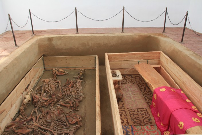 Стеклянный саркофаг над захоронением, который позволит посетителям спуститься в погребальную яму и вблизи увидеть археологические ценности, построили за полтора месяца по поручению акима области Даниала Ахметова. Площадь сооружения из закаленного стекла равна 90 квадратным метрам, а высота от артефактов достигает 8,5 метра.