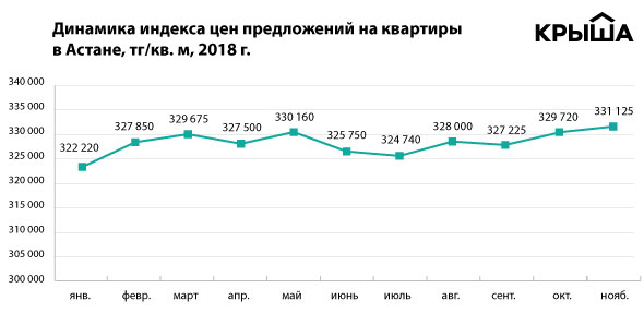 Положительная динамика в пределах 0,4 процента наблюдается в Астане. Средняя стоимость предложений на рынке жилья столицы составляет 331,1 тысячи тенге за "квадрат". Этот показатель стал рекордным для 2018 года.