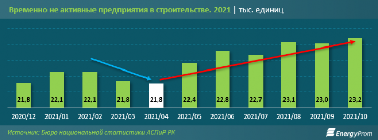 "Наглядно можно наблюдать: с начала текущего года по апрель временно неактивных предприятий в строительстве становилось меньше, то есть экономическая активность росла. Но после скачка цен на стройматериалы в апреле динамика резко сменилась на обратную. Уже начиная с мая наблюдается рост количества временно неактивных компаний. К концу октября показатель достиг 23,2 тысячи — на 6,5 процента больше по сравнению с апрелем текущего года.