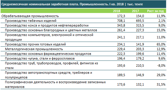 В сфере переработки лучшие зарплаты у сотрудников компаний, производящих табачные изделия, - 708,1 тысячи тенге при росте всего 2,1 процента за год, в сегменте производства кокса и нефтепереработки - 343,8 тысячи тенге, или плюс 9 процентов за год, и в отрасли цветмета - 261,4 тысячи тенге при росте на 15 процентов за год.