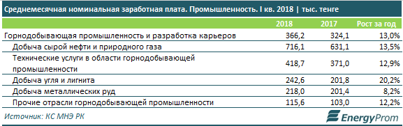 В горнодобывающем сегменте самые высокие зарплаты - в нефтегазовой отрасли: 716,1 тысячи тенге. Рост за год составил 13,5 процента. Также немало получают специалисты в сферах техуслуг горнопрома - 418,7 тысячи тенге при росте на 12,9 процента, и добычи угля - 242,6 тысячи тенге при росте сразу на 20,2 процента за год.