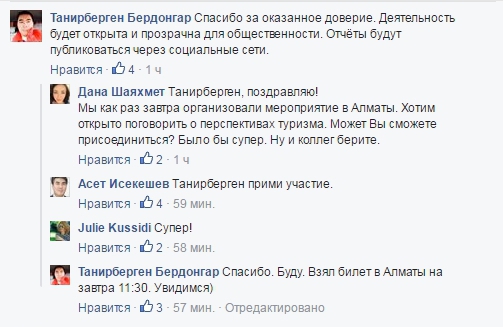 Комментируя сообщение министра экс-мажилисмен пообещал, что его деятельность "будет открыта и прозрачна для общественности", а "отчеты будут публиковаться через социальные сети".