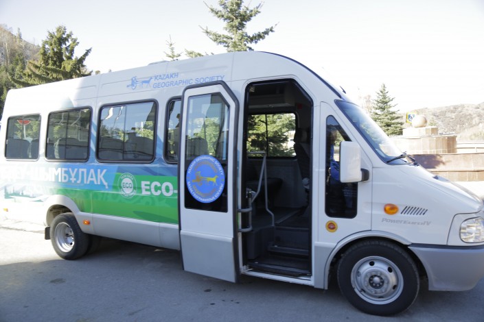 Транспорт рассчитан на 18 посадочных мест, имеет высокую проходимость, систему полного привода и усиленную вентилированную тормозную систему. В настоящий момент маршрут обслуживают четыре микроавтобуса, в среднем осуществляется 48 рейсов в день, перевозятся 864 человека. С открытием зимнего сезона будут курсировать семь экоавтобусов. Стоимость одного посадочного места составляет 200 тенге в один конец.