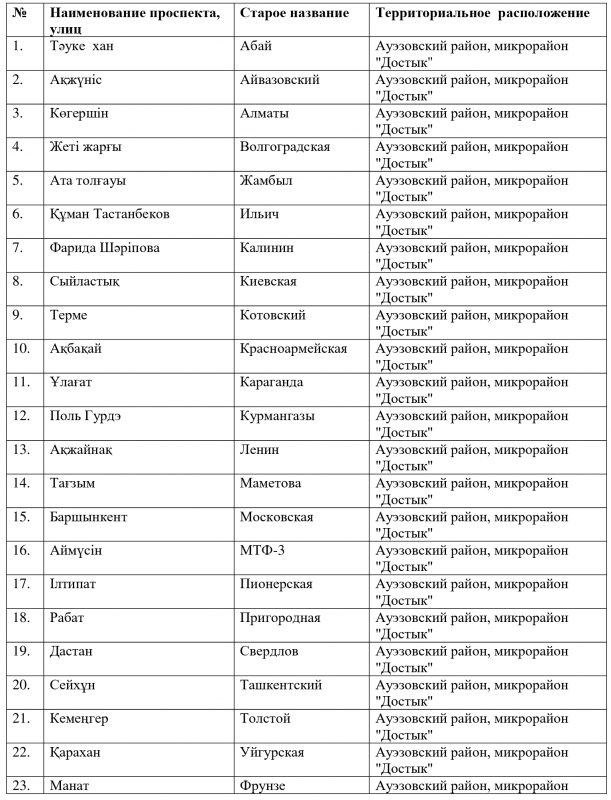 Как стало известно, улицам присвоят имена знаменитых правителей Казахского ханства - Тауке хана, Керей и Жанибек ханов (Керей, Жәнібек хандар), фамилии актеров театра и кино Фариды Шариповой и Кумана Тастанбекова, писателя Абиша Кекильбаева, ученого Василия Бартольда и других.