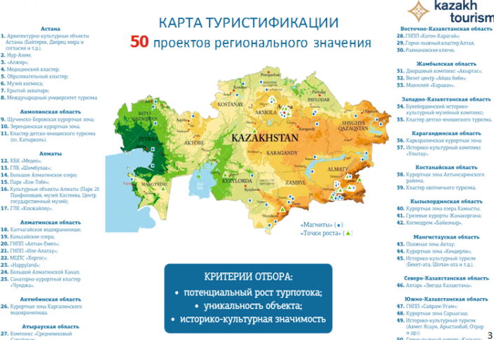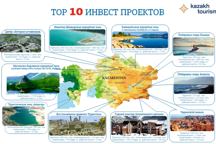 В 10 туристических зон входят: Щучинско-Боровская курортная зона, центр истории кочевников в Астане, туристическая зона Ащисор, восстановление древнего Туркестана, горный кластер Алматинского региона, Чарынский каньон, побережье озера Алаколь, побережье озера Балхаш, Баянаульская курортная зона, Имантау-Шалкарская курортная зона.