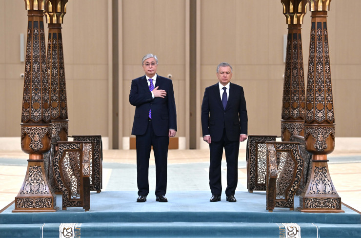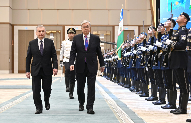 Лидеры двух стран приняли приветственный рапорт начальника роты почетного караула, прозвучали государственные гимны Казахстана и Узбекистана. Касым-Жомарт Токаев и Шавкат Мирзиеев представили друг другу членов официальных делегаций.