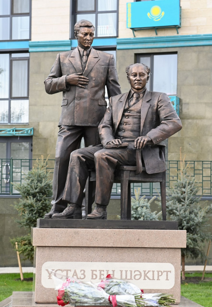 Открытый Президентом памятник "Ұстаз бен шәкірт" ("Учитель и ученик"), посвященный Мухтару Ауэзову и Кайыму Мухамедханову, создан скульптором Нурболом Калиевым.