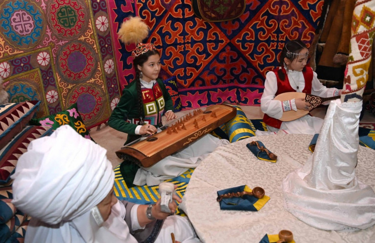 В представленной Президенту инсталляции "Киіз үй" были продемонстрированы мастер-классы для молодежи по искусству вязания, валяния кошмы, плетения, прядения ворса, прессования сырмака.