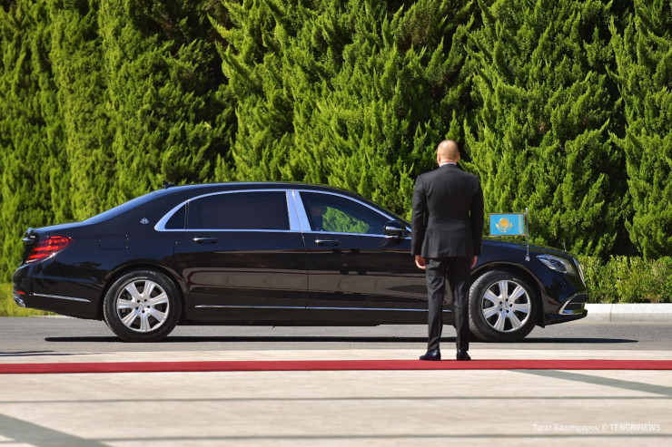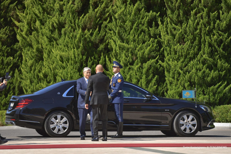 Церемония встречи прошла в торжественной обстановке. Алиев встретил Токаева у автомобиля.