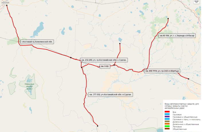 Ограничение движения для всех видов автотранспорта введено на участках автодорог республиканского значения:
