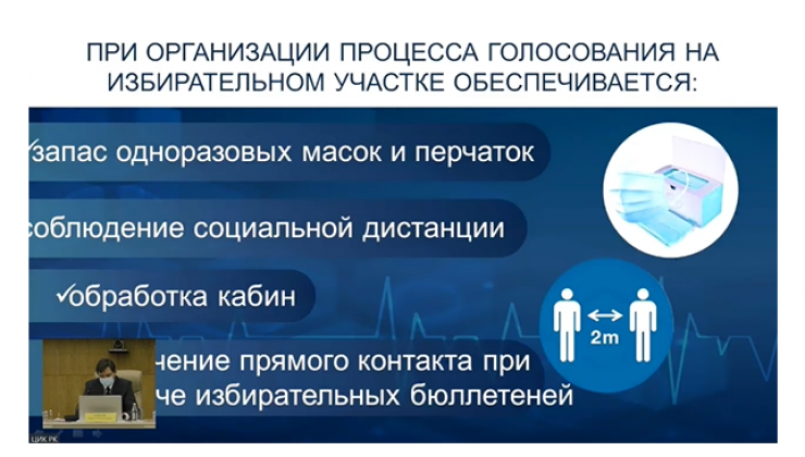 Киясов заявил, что на избирательных участках обеспечен запас одноразовых масок и перчаток, соблюдение социальной дистанции, проводится обработка кабин и организовано ограничение прямого контакта при выдаче избирательных бюллетеней.