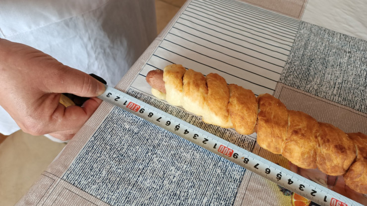 "Мы насадили каждую сосиску на нить, а позже обернули ее тестом. Из-за столь длинного размера, естественно, готовить целиком ее было нереально, так как нет подходящей емкости для обжаривания. Мы поделили ее на две части по 1,5 метра и постепенно обжаривали в емкости с маслом от начала к концу, при этом нужно было ее придерживать со всех сторон и переворачивать для равномерного обжаривания. После полученные две части скрепили между собой еще одним куском теста и обжарили, поливая раскаленным маслом. В итоге у нас получилась цельная сосиска в тесте длиной 3 метра 10 сантиметров", - рассказала она.