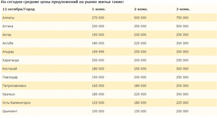 Отмечается, что в Алматы пока снижения не наблюдается, отчасти из-за изменения структуры рынка и дефицита дешевых квартир. На 12 октября город лидирует по абсолютному показателю цен на квартиры - 270 тысяч тенге за однокомнатную, 500 тысяч за двухкомнатную и 750 тысяч за трехкомнатную. На втором месте по ценам Астана - 250 тысяч тенге за однокомнатную, 350 тысяч за двухкомнатную и 500 тысяч за трехкомнатную.