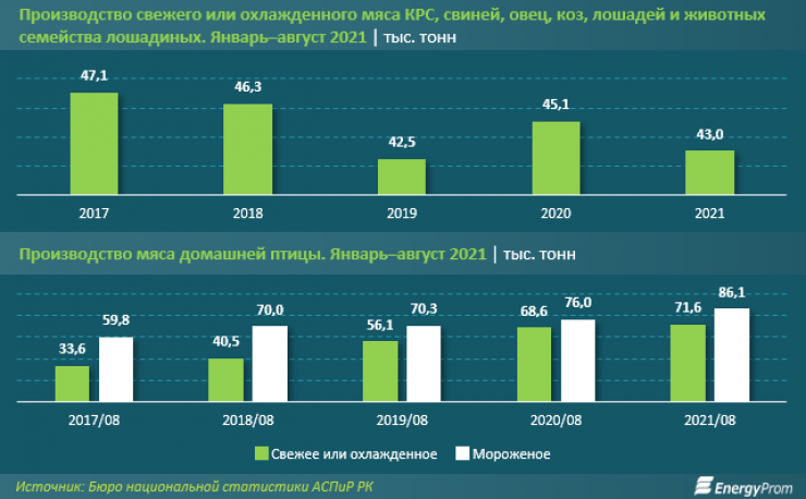 По данным статистики, объем производства мяса с января по август составил 43 тысячи тонн, что на 4,6 процента меньше, чем за 8 месяцев прошлого года. Производство охлажденного мяса птицы, напротив, выросло на 4,3 процента до 71,6 тысячи тонн.