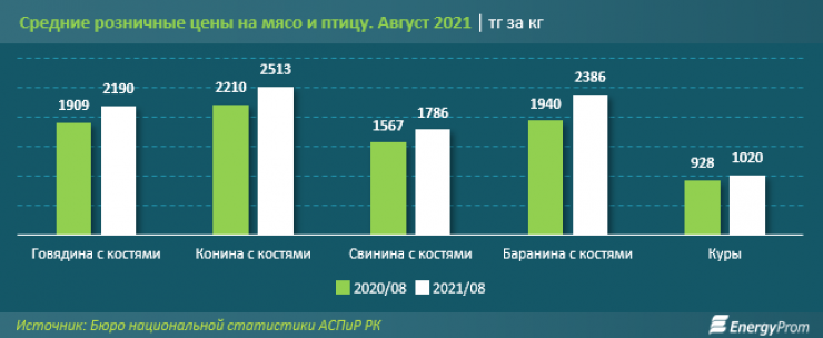 В августе цена говядины с костями в магазинах и на базарах в среднем варьировалась в пределах 2,2 тысячи тенге за килограмм. Конина стоила 2,5 тысячи за килограмм, баранина — 2,4 тысячи тенге.