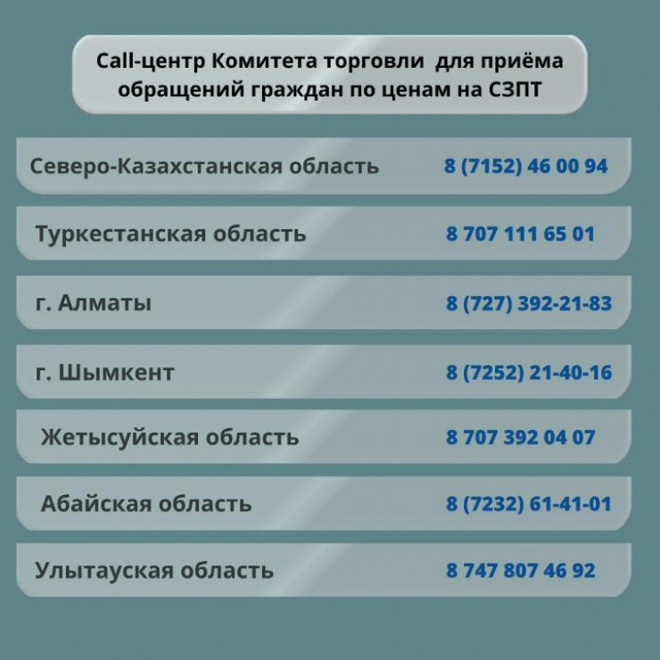 Call-центр для обращений казахстанцев создан во всех регионах страны. По данным ведомства, он создан для повышения достоверности анализа данных и учета обращений граждан, столкнувшихся с завышенными ценами на социально значимые продукты питания в магазинах у дома, рынках, супермаркетах и других организованных местах торговли.