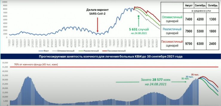 "Министерством обновлен прогноз эпидемиологической ситуации по коронавирусной инфекции до ноября. Так, при пессимистичном сценарии среднесуточное число зарегистрированных случаев в сентябре составит до 6300 случаев, в октябре - до 2400 случаев. При реалистичном сценарии в сентябре - до 5300 случаев, в октябре – до 1800 случаев. При оптимистичном сценарии в сентябре - до 4200 случаев, в октябре – до 1300 случаев в сутки", - сообщил Цой на заседании правительства.