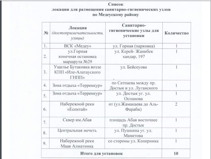 Уже известны и локации установки сортиров. По одному установят на парковке по улице Горная, недалеко от высокогорного катка "Медеу", и на конечной остановке маршрута № 29. Планируется возвести клозеты на КПП в ущелье Бутаковка, возле Дворца Республики, около Центральной мечети и вдоль набережной реки Малая Алматинка. По два туалета построят в зоне отдыха "Терренкур" и возле реки Есентай.