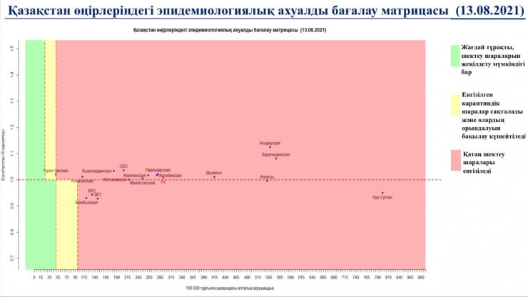Согласно матрице оценки эпидемиологической ситуации в регионах Казахстана на 14 августа 2021 года