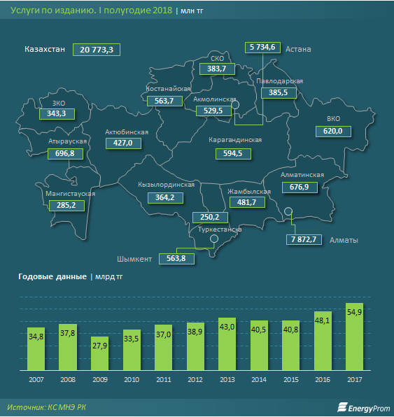 В первом полугодии издательские услуги составили 20,7 миллиарда тенге - на 4,6 процента больше, чем годом ранее.