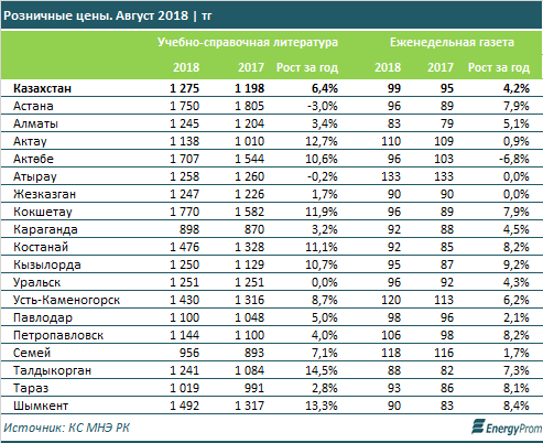 Еженедельные газеты по итогам августа обходились в среднем в 99 тенге - на 4,2 процента дороже, чем годом ранее.