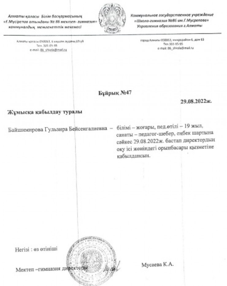 "Калдыкыз Мусаева 31 августа написала заявление на увольнение по собственному желанию в связи с семейными обстоятельствами. Гульзира Байшимирова была принята на работу 29 августа в качестве заместителя директора по учебной работе, так как была вакансия на две ставки. Подпись Мусаевой является подлинником (факсимиле)", - сообщили в управлении.