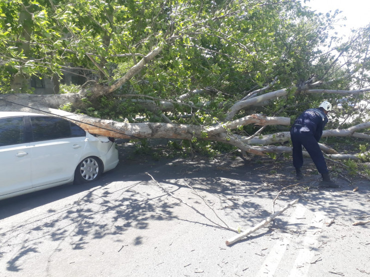 Накануне сильный ветер повалил дерево, которое задело стоявший рядом автомобиль.