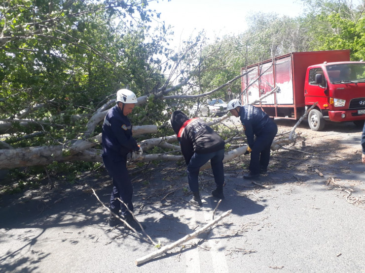В разных частях города сорвало кровлю домов, зданий и повалило деревья. В районе городского Арбата ветром сорвало кровлю многоэтажки. Похожая ситуация произошла в районе Тамерлановского шоссе, там сильный ветер сорвал обшивку с жилого дома.