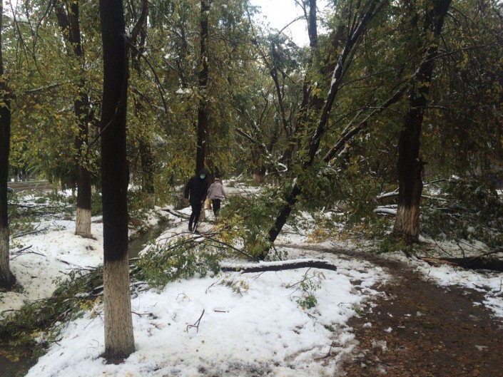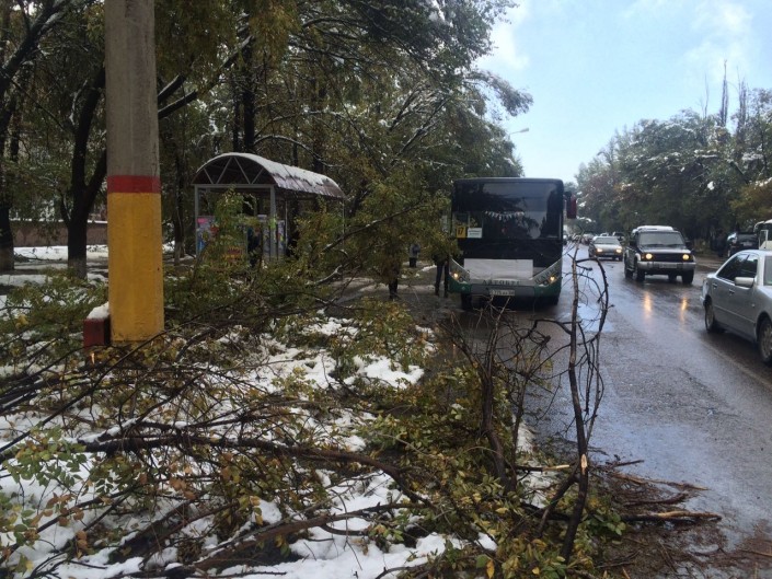 Тем временем, деревья падали также и в Алматы, где в ночь на 14 октября выпал первый снег. Как уточнили в городском ДЧС, всего было зафиксировано 4 таких случая - деревья и ветки падали на дорогу. Пострадавших нет.