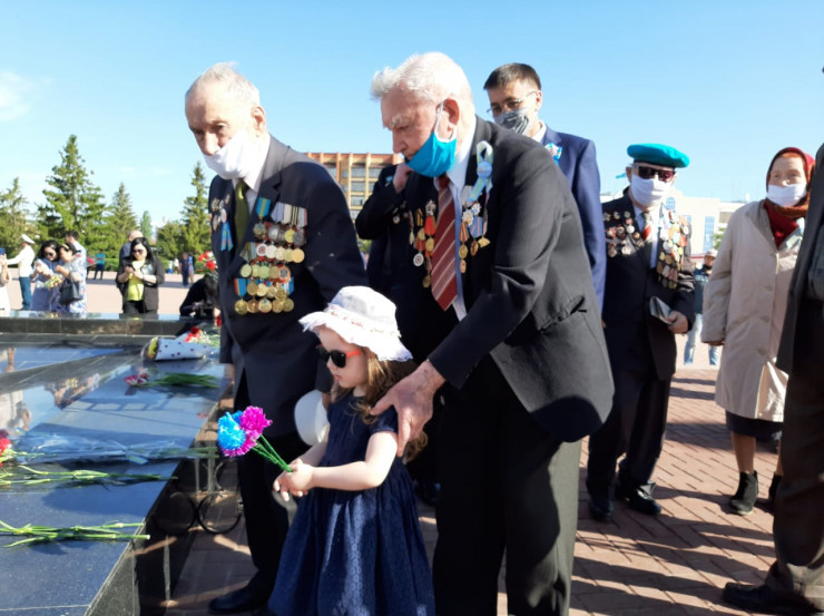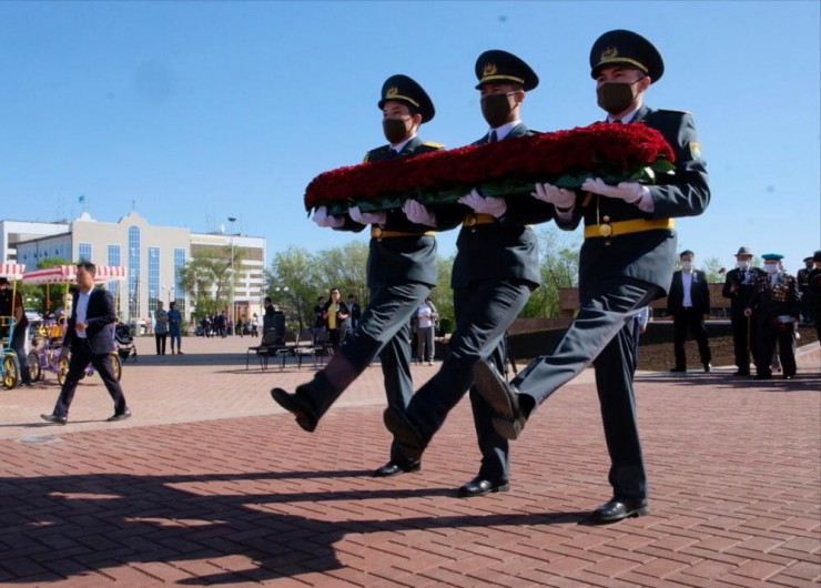После торжественной части состоялось возложение цветов к Вечному огню. Сразу же после окончания поздравления мобильные группы, состоящие из сотрудников акимата, спортсменов и деятелей культуры, отправились по домам поздравлять ветеранов. Такое решение было принято, чтобы уберечь пожилых людей от заражения коронавирусом.