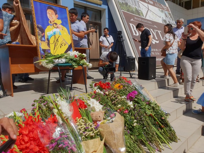 В Уральске у ледового дворца спорта собрались сотни горожан. У входа соорудили уголок, посвященный именитому спортсмену. Сюда люди несли цветы и мягкие игрушки. На экране демонстрировали фрагменты из выступлений Дениса Тена.