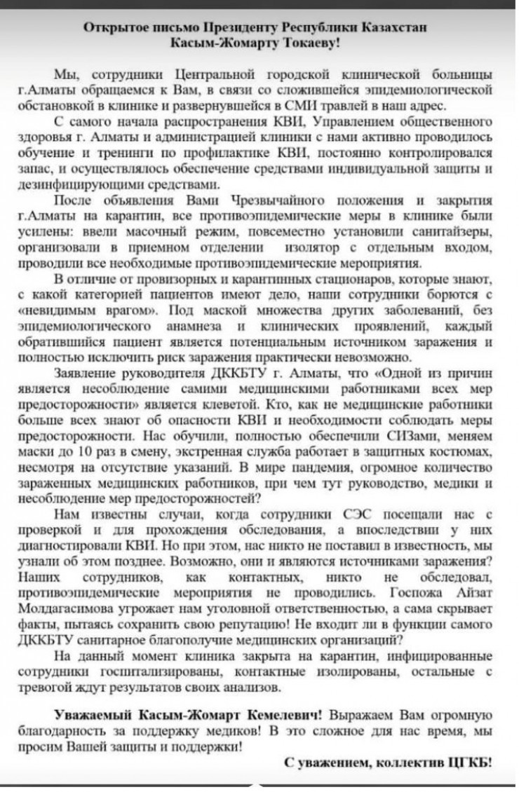 "Тауарлар мен қызметтердің сапасы мен қауіпсіздігін бақылау бөлімі бастығының "себептердің бірі медициналық қызметкерлердің барлық сақтық шарасын сақтамауы" деген мәлімдемесі - жала жабу. COVID-19 қаупі және сақтық шараларын қабылдау қажет екені туралы медициналық қызметкерлерден артық кім біледі?", - делінген үндеуде.