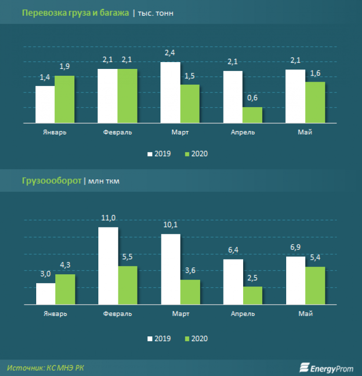 Грузооборот за пять месяцев составил 21,3 миллиона тонно-километров — на 43,1 процента меньше, чем годом ранее. В мае грузооборот достиг 5,4 миллиона километров, увеличившись по сравнению с "карантинным" апрелем в 2,1 раза.
