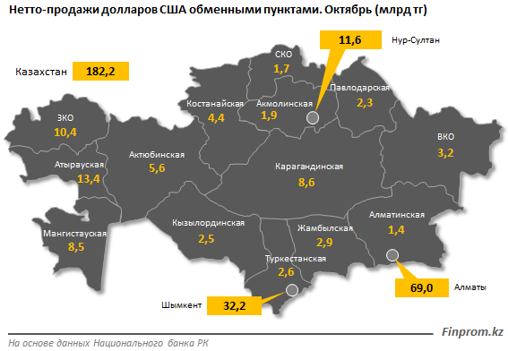 По данным аналитического портала, в октябре во всех регионах Казахстана наблюдался положительный рост продаж доллара. Максимальный уровень продаж американской валюты пришелся на Алматы и Шымкент: 69 миллиардов и 32,2 миллиарда тенге, соответственно. На третьем месте Атырауская область: 13,4 миллиарда тенге.