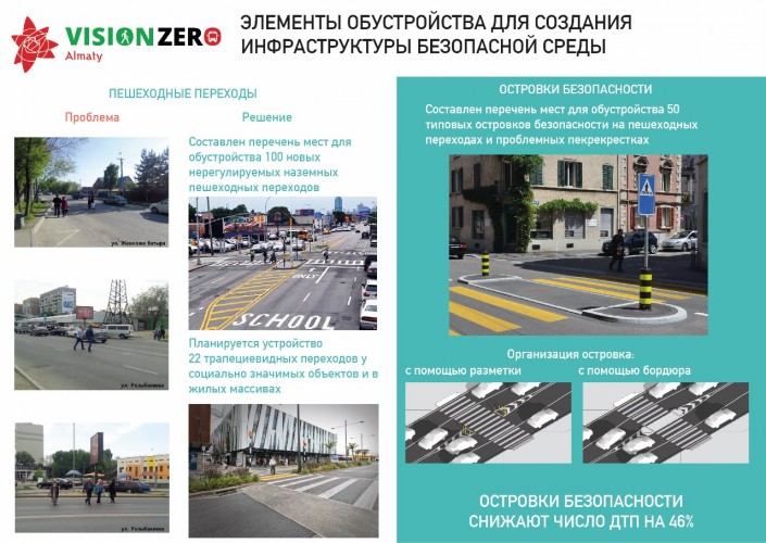 "В целом по городу при активном участии горожан выявлены 72 проблемных участка с высоким уровнем аварийности, где по аналогии с передовыми мегаполисами планируется сузить радиус поворотов, увеличить интервал светофоров для пешеходов, перенести стоп-линии и другое. Кроме того, запланировано строительство 100 новых пешеходных переходов. По многочисленным просьбам горожан на 50 участках будут обустроены островки безопасности, разделяющие широкую проезжую часть. Возле социальных и образовательных объектов принято решение организовать приподнятые трапециевидные пешеходные переходы", - сообщил аким.