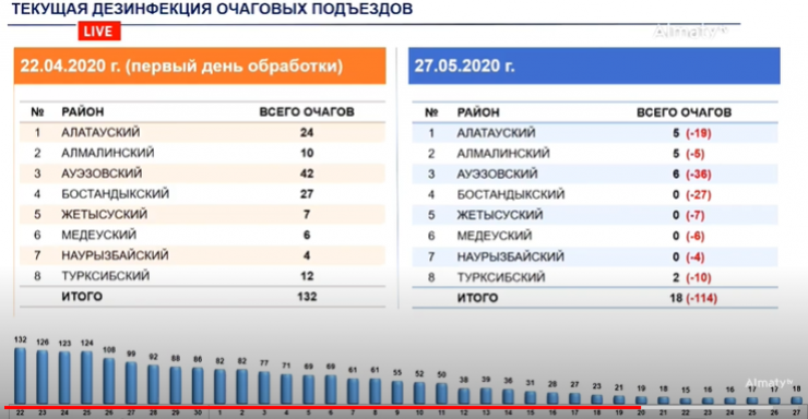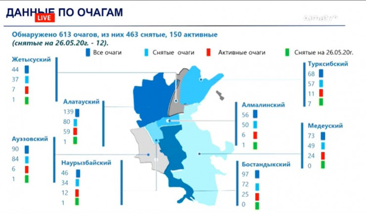 "Всего с момента обнаружения первого случая коронавируса было 613 очагов, 464 сняты, сегодня - 150 очагов", - сообщил аким Алматы на брифинге по вопросам жизнедеятельности мегаполиса в условиях карантинного режима.
