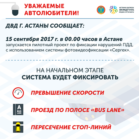 С 15 сентября 2017 года в Астане запущена процедура возбуждения административных дел по фактам нарушения ПДД, зафиксированным сертифицированным оборудованием фото- и видеофиксации "Сергек".