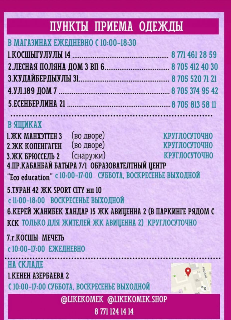 - улица Косшыгулулы, 14 (магазин), 10:00-19:00 без выходных;