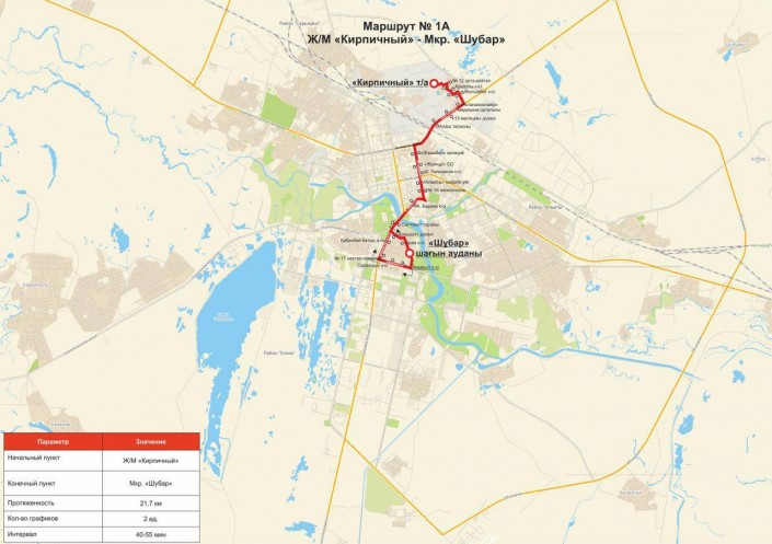 Маршрут № 1А начинает движение от начального остановочного пункта "жилой массив "Кирпичный" до остановочного пункта "Улица Бараева" согласно схеме движения маршрута № 1, далее прямо по проспекту Кабанбай батыра, налево на улице Космонавтов - направо на улице Арай - конечный пункт "микрорайон Шубар".