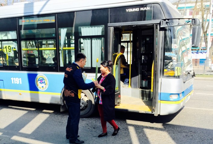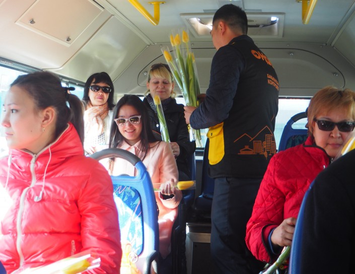 В автобусах Алматы контролеры "Онай" дарили женщинам цветы Фото предоставлено пресс-службой ТОО "Транспортный холдинг города Алматы".