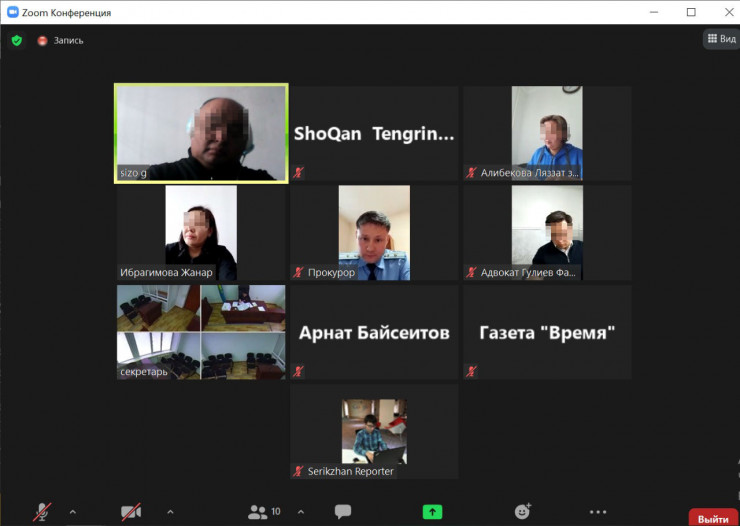 Суд по делу экс-директора алматинского морга Бахытжана Алибекова (в крайнем верхнем левом углу) в онлайн-режиме через Zoom