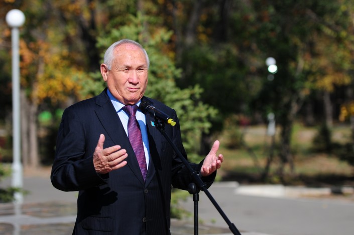 Далее с поздравительной речью выступили председатель Союза писателей Казахстана Нурлан Оразалин и молодой поэт Жамбыл Дуйсенов, зачитавший стихи собственного сочинения, посвященные Жамбылу Жабаеву.