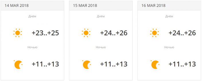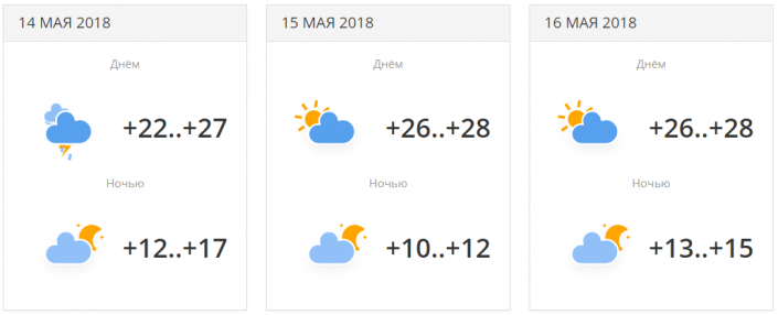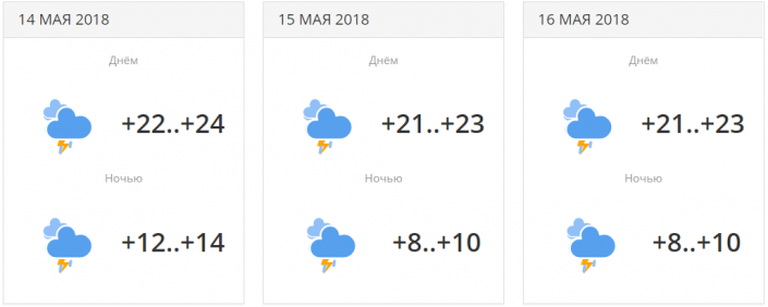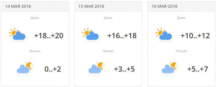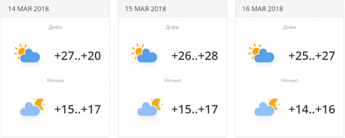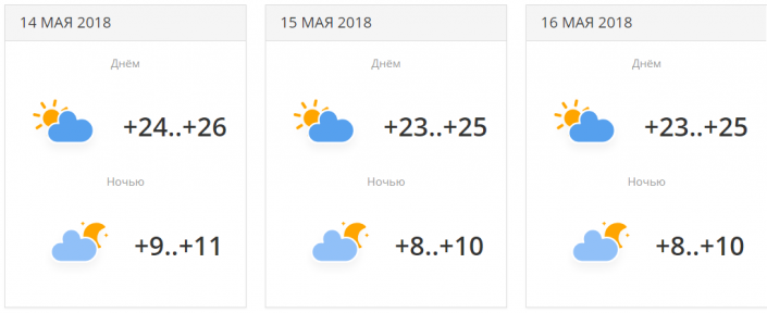 В городе прогнозируется три дня осадков с переменной облачностью. Температуры будут находиться в районе +19...+23 градусов днем. 16 мая ночью ожидается понижение температуры до +7...+9 градусов.
