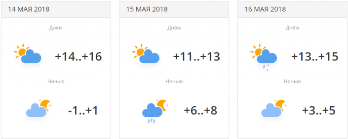 14 мая ночью ожидается минусовая температура: -1...+1. 16 мая - сильный дождь с грозой, +17...+19 градусов тепла.