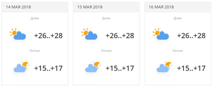 С 14 по 16 мая ожидается переменная облачность, температура установится в районе +26...+28 градусов днем и +15...+17 градусов ночью.