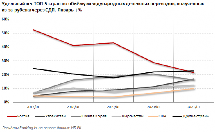 На топ-5 стран по объему полученных оттуда через СДП сумм в январе 2021 года приходится более 77 процентов от общего объема. Самая значительная доля традиционно у России: 21,5 процента, при этом в прошлом году на Россию приходилось 28,9 процента, а в январе 2017 года - более половины объема.