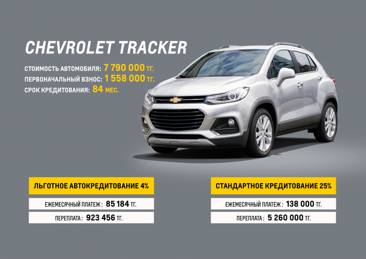 Цена нового кроссовера Chеvrolet Tracker составляет 7 790 000 тенге. Ниже мы приводим сравнительный анализ по льготному и обычному кредитованию на покупку этой модели сроком на семь лет в одном из банков Казахстана.