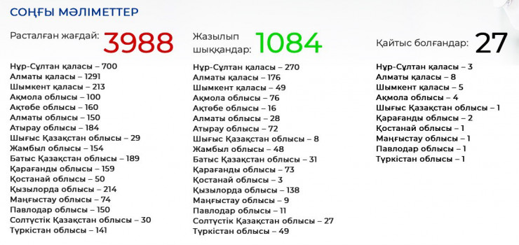 В Казахстане зарегистрировали 3988 случаев коронавируса, передает Tengrinews.kz со ссылкой на Coronavirus2020.kz.